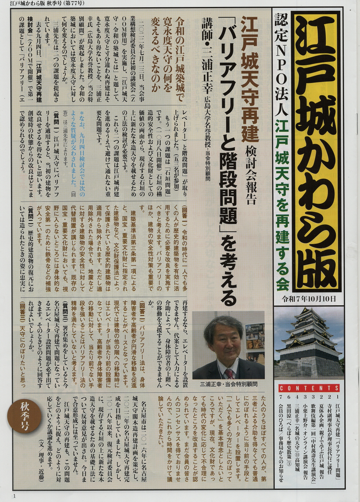 | 第77号 PDFで読む | 江戸城天守再建「バリアフリーと階段問題」。寺村副理事長が理事長代行に就任。親子で学ぶ江戸城報告。江戸文化サロン「歌舞伎編第1回」。名城の天守33・高知城。「べらぼう」歴史散策3。(注:会員から個人情報公開の許可を得ていない7ページの一部を除いて掲載) |